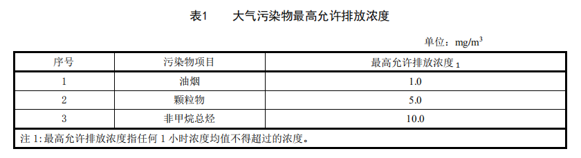 4.1.1 自本標(biāo)準(zhǔn)實(shí)施之日起,餐飲服務(wù)單位排放的油煙、顆粒物的最高允許排放濃度,應(yīng)符合表 1 的規(guī)