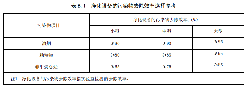 4.2.5 餐飲服務(wù)單位應(yīng)根據(jù)其規(guī)模、主要污染物等情況,選擇相應(yīng)去除效率的凈化設(shè)備,以確保達(dá)標(biāo)